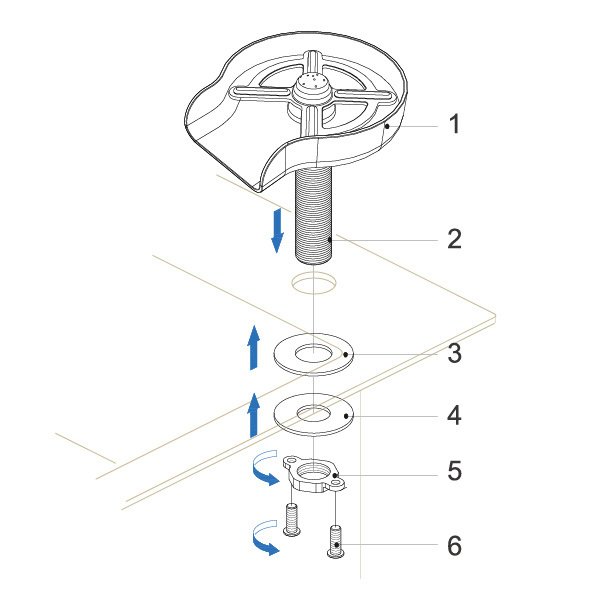 Slide Mounting Shank (2) Through Sink From Above; Then Slide The Shank(2)through The Rubber Washer(3); then Through The Steel Support Washer (4).Ensure Base Is Aligned With Sink And Outlet Extends Into Basin Prior To Fully Tightening Mounting Nut(5); Tightening The Screws (6).
