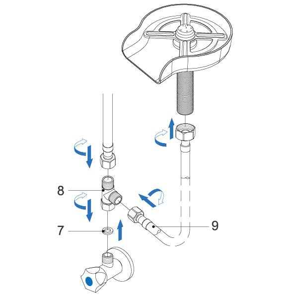 First Screw The Tee (8) And Rubber Washer (7) On The Angle Valve ; And Then Screw The Tap Hose On The Tee (8). Screw One End Of The Supply Hose (9) Onto The Tee (8) And The Other End Onto The Mounting Shank (2).