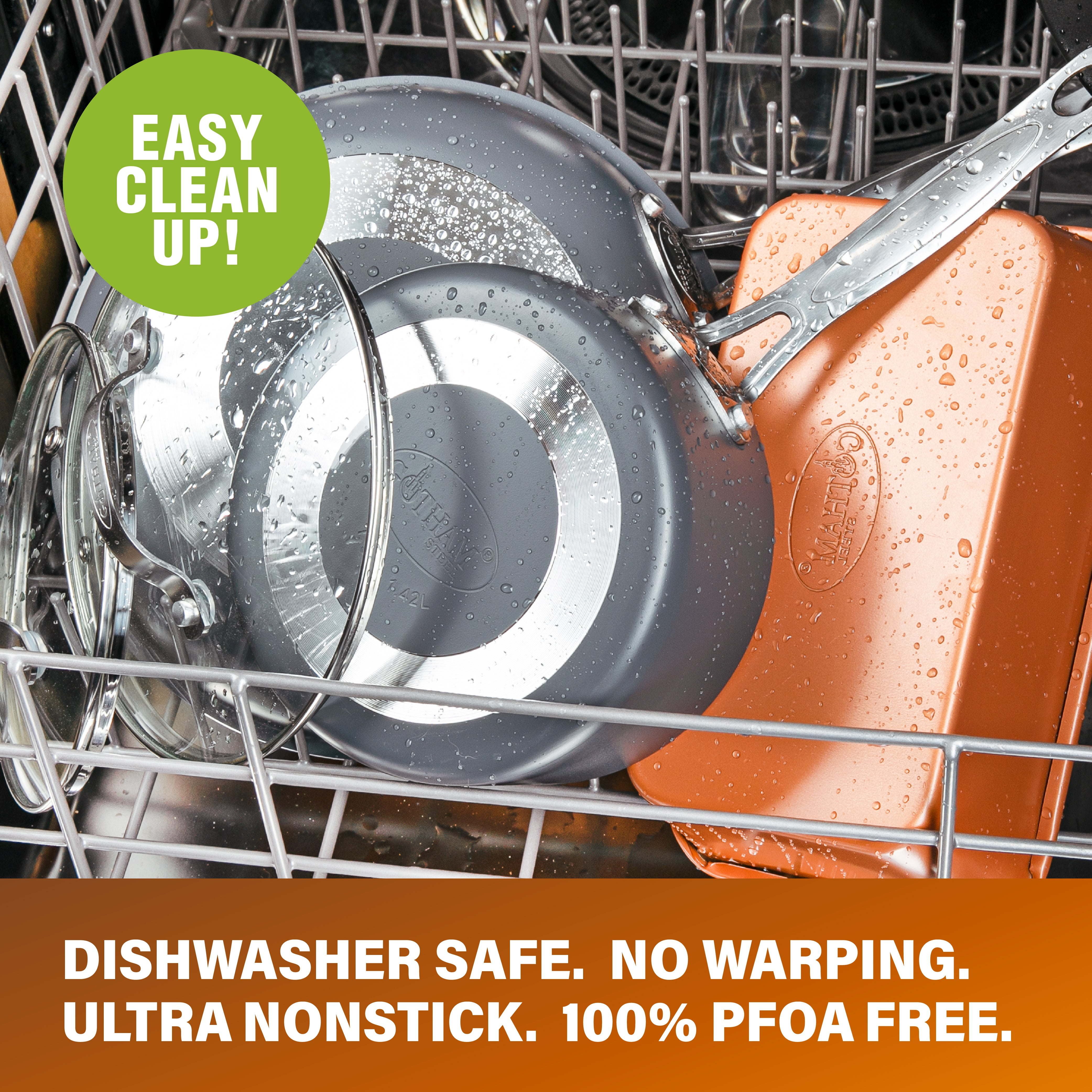 • DISHWASHER SAFE spend less time with cleanup! After all the cooking and prepping is done, place cookware in the dishwasher for quick and easy cleanup.